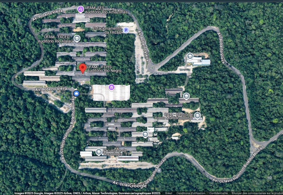 O evento será realizado no Auditório Rio Negro, no Instituto de Filosofia, Ciências Humanas e Sociais (IFCHS) da UFAM. Clique na imagem abaixo para acessar a localização do auditório.